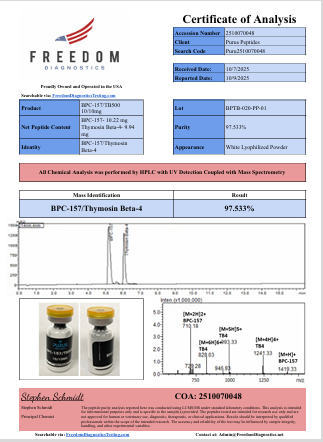 All items available on this website are intended exclusively for research and development purposes, including laboratory and analytical applications, and are not meant for human or animal consumption in any form. The products are not designed to diagnose, treat, cure, or prevent any medical conditions, and their associated claims have not been reviewed or approved by the U.S. Food and Drug Administration. Purus Peptides operates solely as a supplier of research chemicals and is neither a compounding pharmacy nor an outsourcing facility as defined by sections 503A or 503B of the Federal Food, Drug, and Cosmetic Act